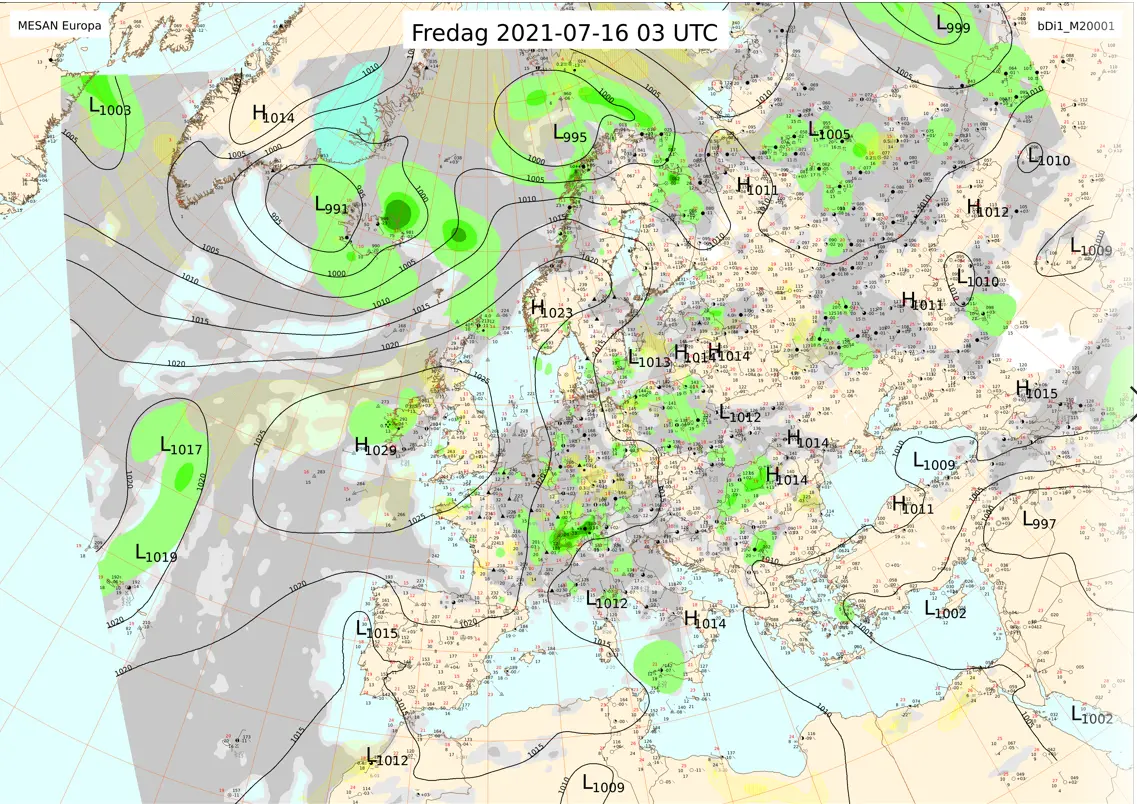 Förstora bildenAnalys av väderläget över Europa klockan 05 den 16 juli 2021.