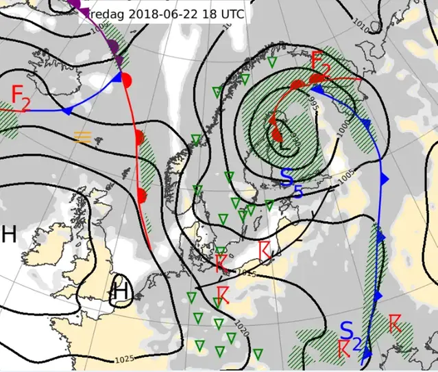 Förstora bildenAnalys av väderläget klockan 20 på midsommarafton den 22 juni 2018.