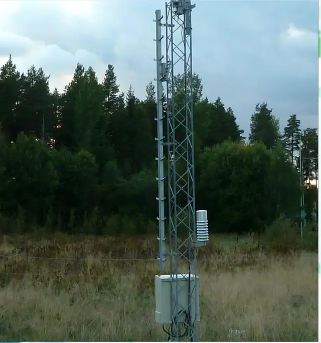 Förstora bildenPå Trafikverkets VViS-stationer används ett något smalare strålningsskydd. Numera används även strålningsskydd av samma typ som SMHI använder. Bilden visar VViS-stationen i Sävast i Norrbotten.