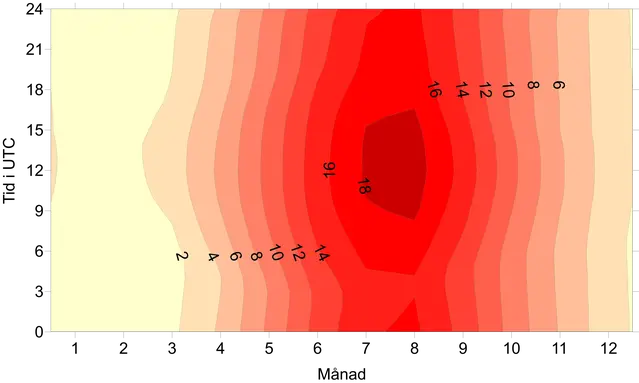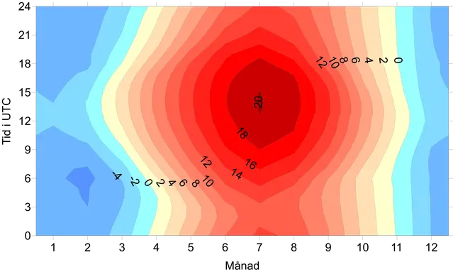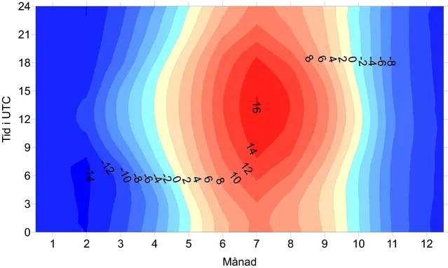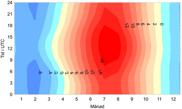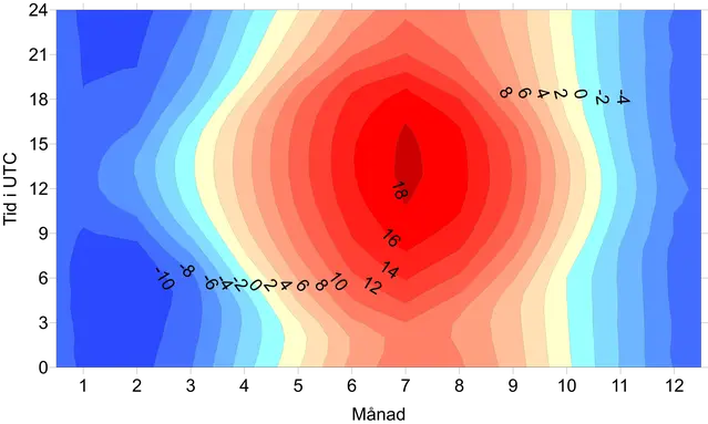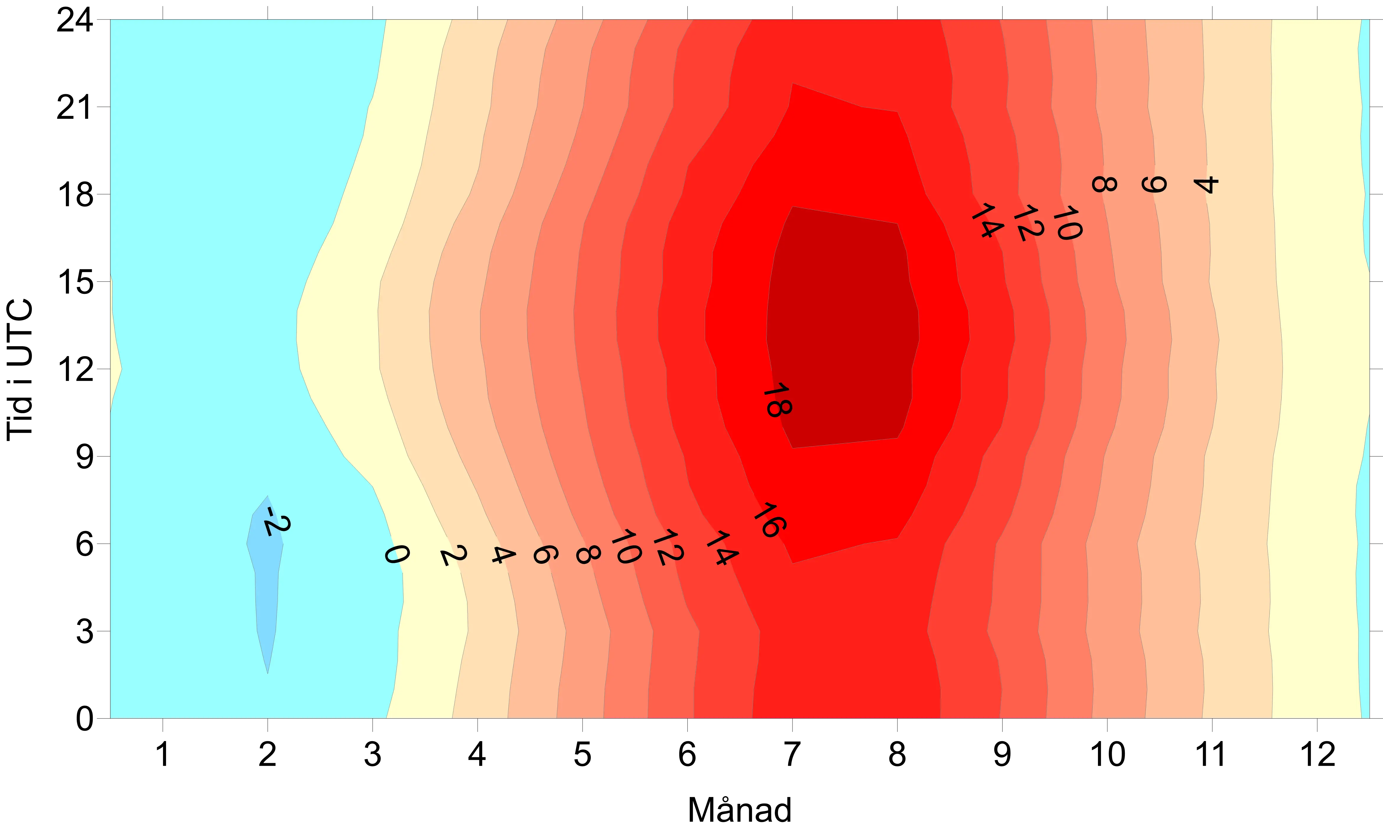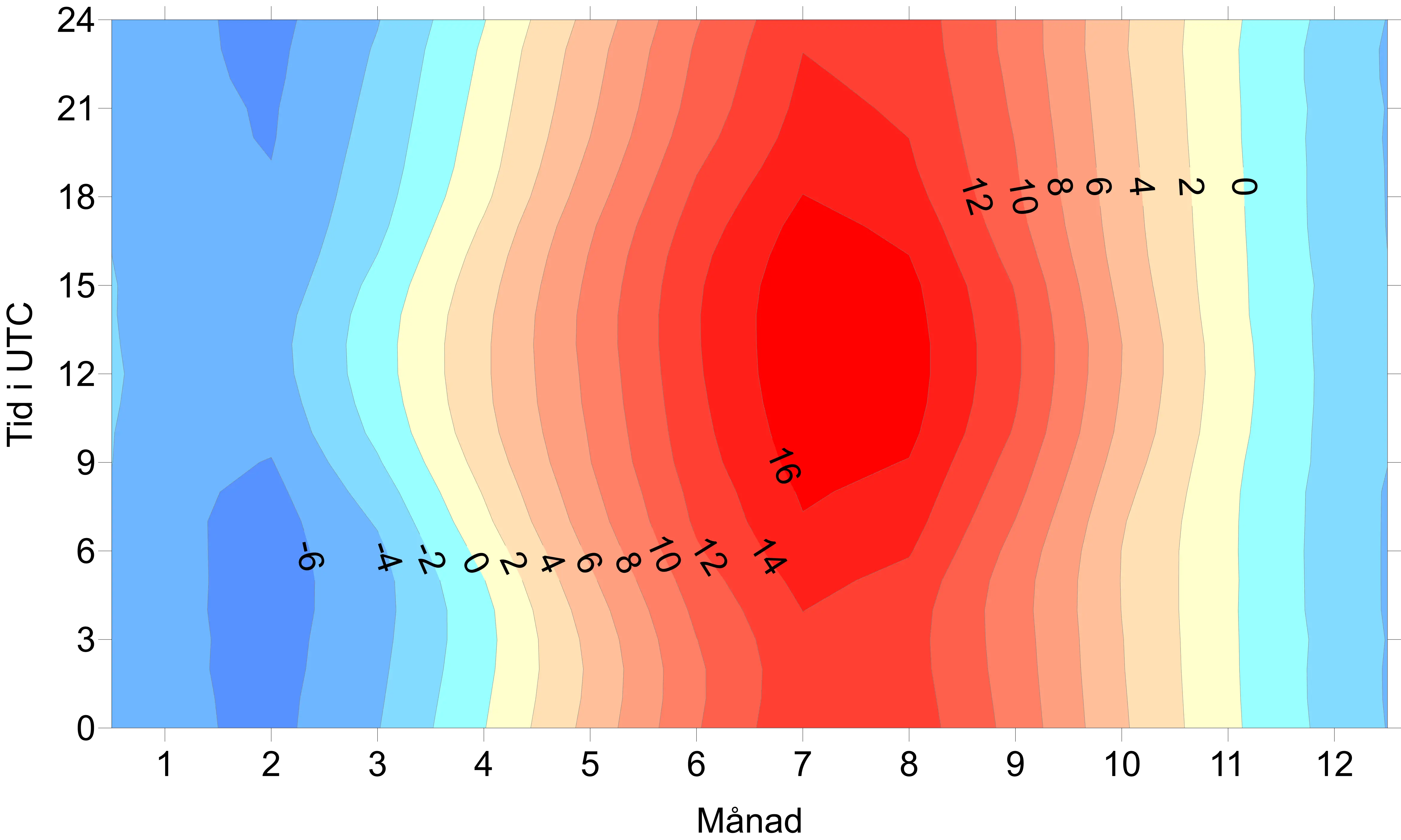För ett urval av stationer presenteras nedan genomsnittlig temperatur under olika månader och tider på dygnet. De valda stationerna är automatstationer som startade 1995/96. Tiden i diagrammen är i UTC. För att få svensk normaltid adderas en timme till UTC och för att få svensk sommartid adderas två timmar.