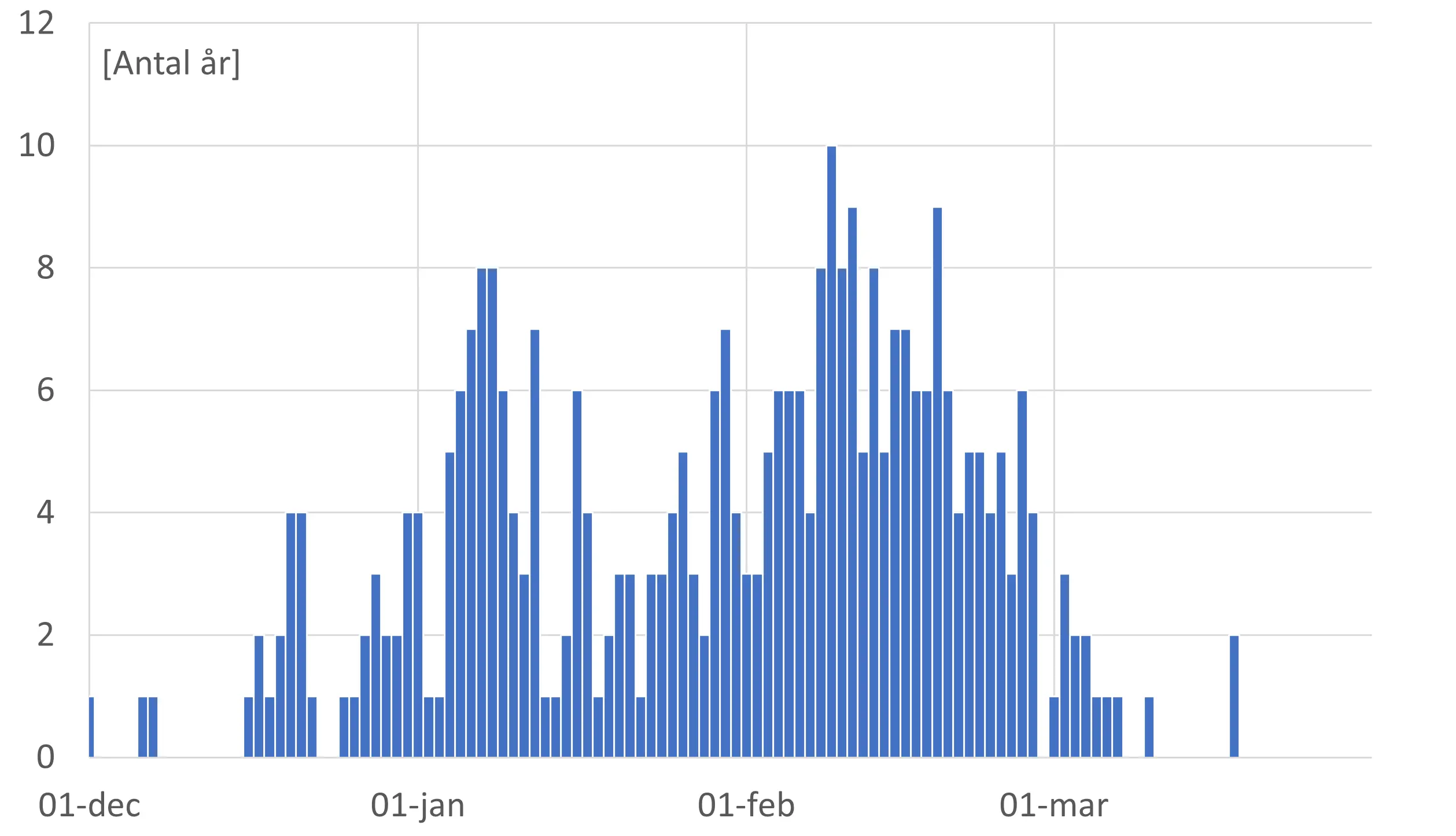 Nationella isdygn är som mest frekventa under februari följt av januari, vilka även statistiskt sett är de kallaste månaderna, se figur nedan. Från figuren ser vi också att det är ovanligt med nationella isdygn före mitten av december eller efter mitten av mars.
