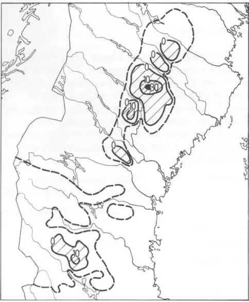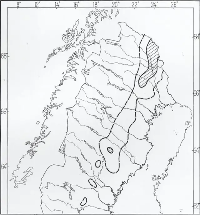 Förstora bildenInom de streckade områdena föll snö eller snöblandat regn den 30-31 augusti 1986. Snötäcke med ett djup av 0-4 centimeter rapporterades från de streckade områdena.