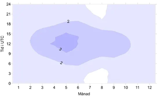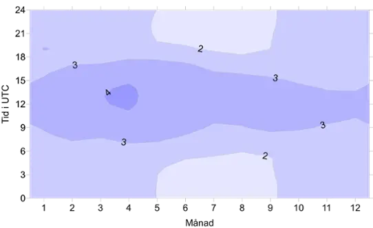 På stationen i Naimakka blåser det i genomsnitt mest mitt på dagen under vårmånaderna, se diagram nedan. Diagrammen för inlandsstationerna Åsele, Mora och Hörby har ett liknande utseende som Naimakka. Vid kuststationerna blåser det dock mest på vintern och dygnsrytmen är mindre än vid inlandsstationer.