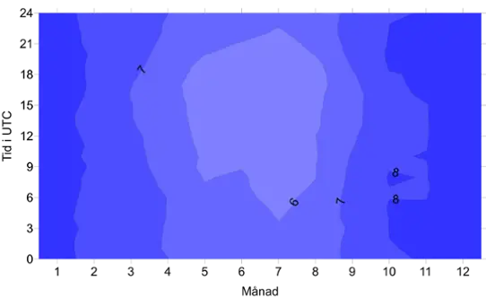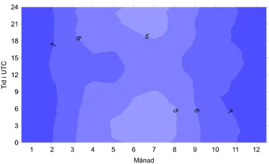 För ett urval av stationer presenteras nedan genomsnittlig vindhastighet under olika månader och tider på dygnet. De valda stationerna är automatstationer som startade 1995/96. Tiden i diagrammen är i UTC. För att få svensk normaltid adderas en timme till UTC och för att få svensk sommartid adderas två timmar.