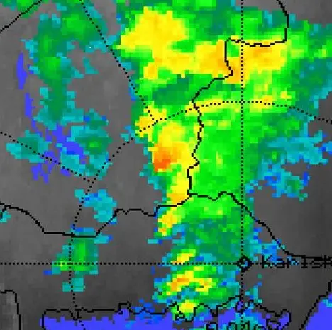 Radarbild från klockan 13:45 den 22 augusti 2012. Ett krokformat radareko syns i trakten av Rävemåla i sydöstra Småland. Den typen av radareko är en indikation på att tromber kan ha förekommit.