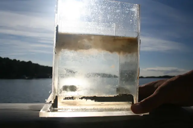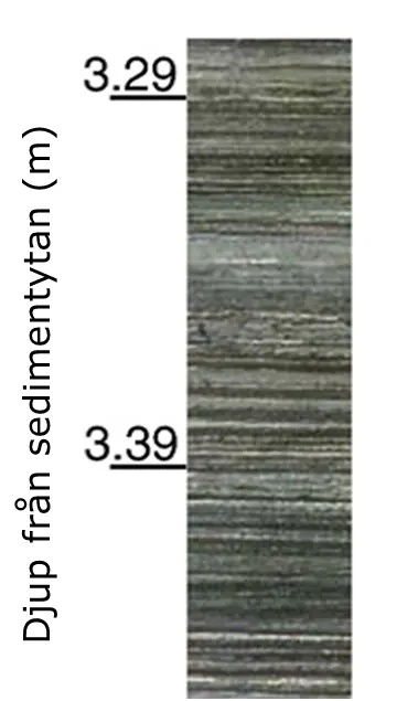 Fotografiet till vänster är från en borrkärna man tagit upp från sedimentet på 240 m djup i Gotlandsdjupet. De omväxlande mörka och ljusa skikten visar att det tidigare varit perioder med syrefritt respektive syrerikt bottenvatten i Östersjön.