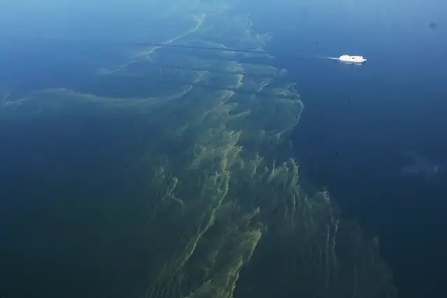 Här kan man se hur cyanobakterierna har flutit upp och bildat ”mattor” i ytan.