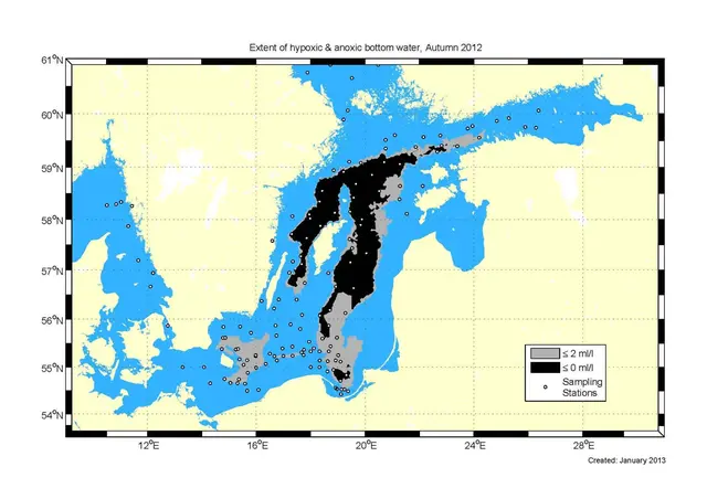 Det svarta området i kartan är syrefria bottnar, grått innebär en syrehalt under 2 ml/l, vilket är den gräns då fisk flyr.
