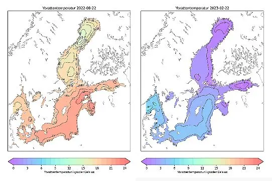 Förstora bildenExempel på ytvattentemperaturer i havet sommar- och vintertid. På sommaren är temperaturen runt 20 grader i söder, men svalare i norr. På vintern är temperaturen nära fryspunkten i norr och öster, medan de södra och västra delarna sällan blir såpass avkylda.