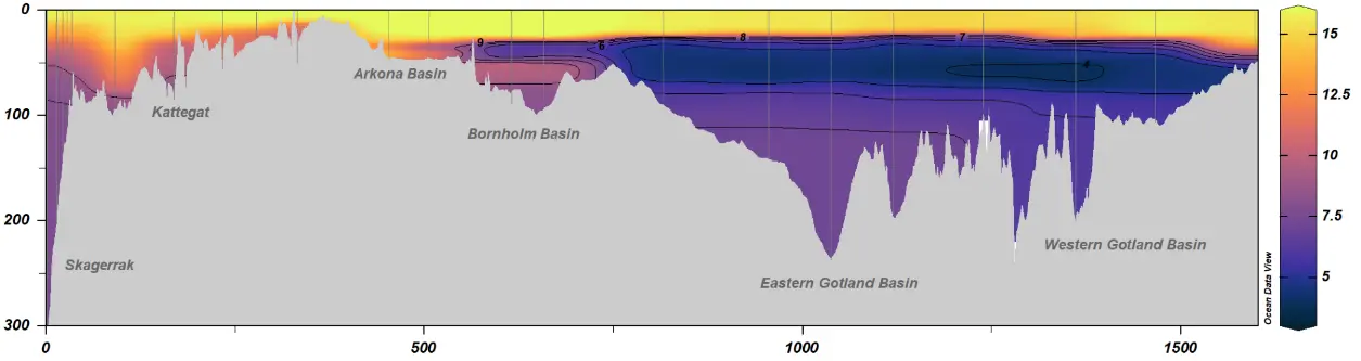 Förstora bildenExempel på hur temperaturskiktningen mätt från forskningsfartyget Svea kan se ut under en expedition i september 2022. Tvärsnittet går från Skagerrak och upp motsols runt Gotland. X-axeln visar avstånd i km, den grå skuggningen djupet och färgskalan temperaturen i grader C.