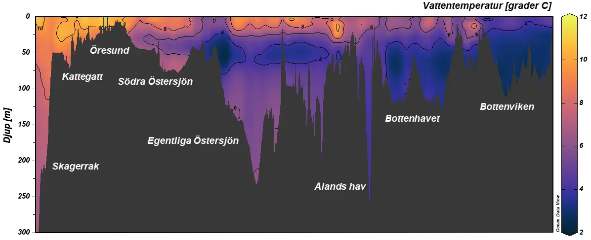 Förstora bildenEtt tvärsnitt genom Sveriges omgivande hav från Skagerrak till Bottenviken. Den mörkgrå skuggningen visar djupen och färgskalan vattnets medeltemperatur i grader C. Data är medelvärden för 1955-2018 från en återanalys.