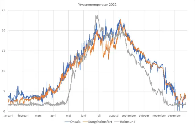 Förstora bildenExempel på hur ytvattentemperaturen varierar under ett år vid tre svenska mätstationer. Onsala på västkusten, Kungsholmsfort i södra Östersjön och Holmsund i norra kvarken.
