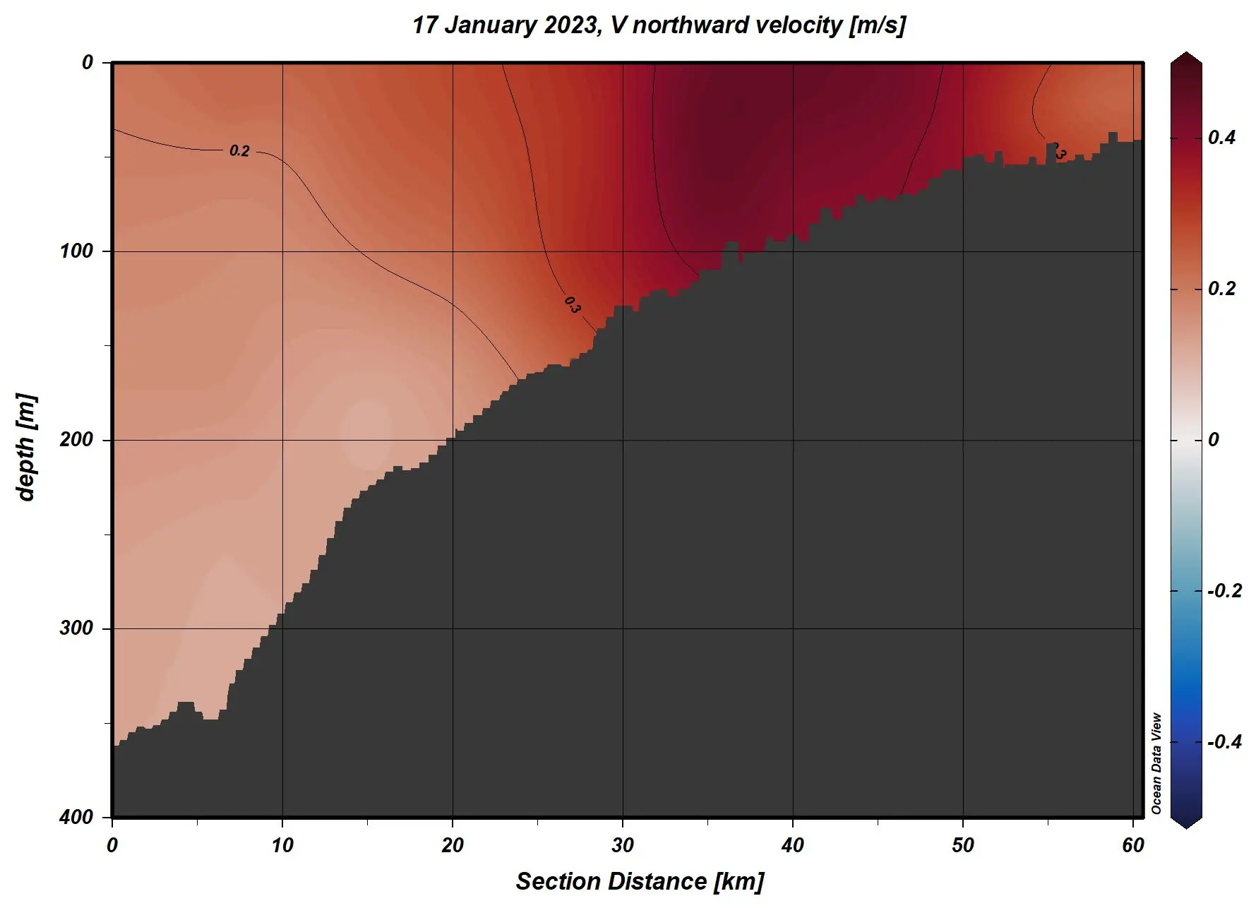 Förstora bildenStrömhastighet uppmätt från forskningsfartyget Svea längs Å-snittet, som går i öst-västlig riktning utanför Lysekil i Skagerrak. Det mörkröda området visar den nordgående Baltiska strömmen.
