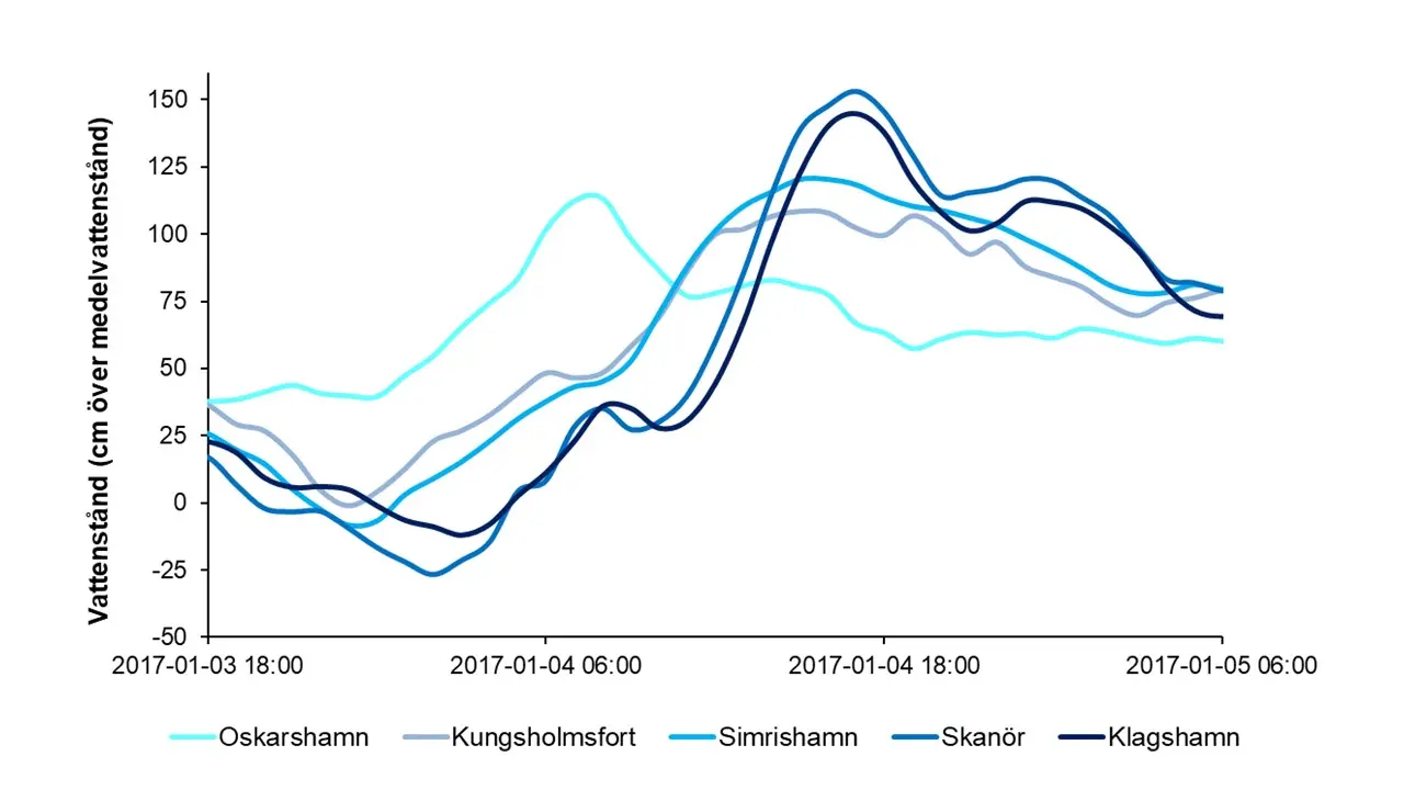 Den 4 januari 2017 steg vattenståndet till rekordhöga nivåer på flera platser längs ost- och sydkusten. Nivåer på omkring 110 cm över medelvattenstånd registrerades längs ostkusten, 110 – 140 cm längs sydkusten och omkring 150 cm över medelvattenstånd uppmättes söder om bron i Öresund. Vattenståndet var högt, över 100 cm över medelvattenstånd, mellan ca 3 och 13 timmar och en medelvind på 25 meter per sekund registrerades vid Landsort.