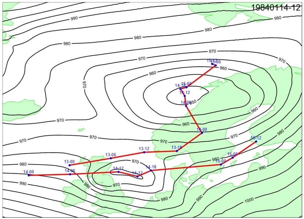 Förstora bildenLufttryck och lågtrycksbanor över Sverige 13 – 14 januari 1984 från återanalysmodellen EURO4M.