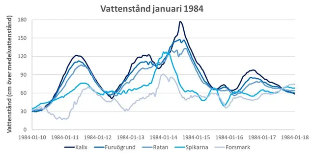 Före januari 1984 hade det aldrig tidigare registrerats vattenstånd över 150 centimeter över medelvattenstånd vid mätstationen i Kalix. Nivåer högre än 140 centimeter över medelvattenstånd har hittills endast uppmätts vid fem tillfällen under Kalix knappt 50 år långa mätserie. Mätdataserien vid Furuögrund är över 100 år lång och här har vattenstånd högre än 140 centimeter över medelvattenstånd endast registrerats vid två tillfällen, 1984 och 2002.