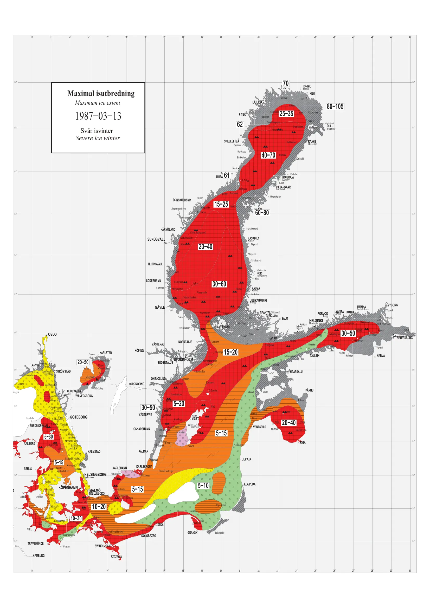 Extrema svåra förhållanden skapas vissa vintrar, då större delen av Östersjön blir täckt av is. Till exempel vintern 1986/1987 var en sådan, med en maximal isutbredning av 394 000 km2.
