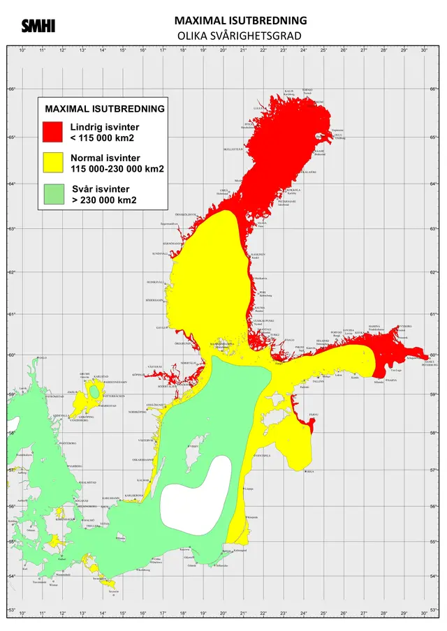 Gränsen mellan normal och svår isvinter går vid en maximal isutbredning på 230 000 km2.