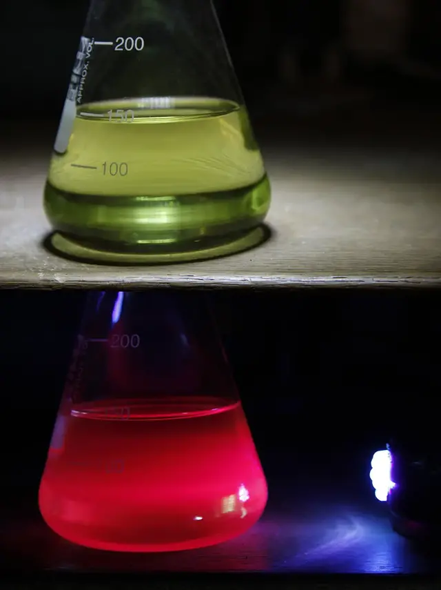 Lösning av klorofyll i etanol belyst med vanligt ljus och UV-ljus som får klorofyll att fluorescera.
