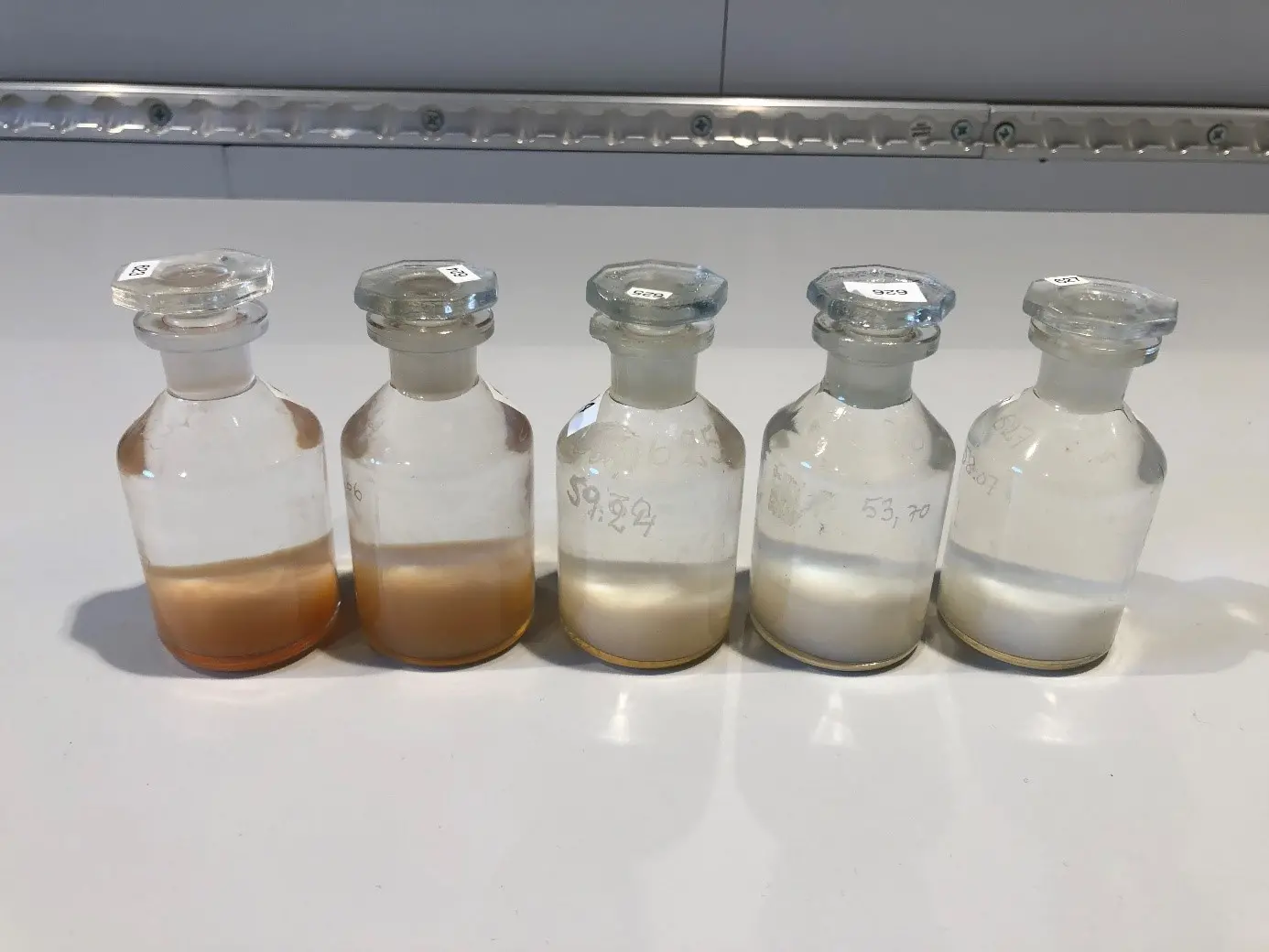 Förstora bildenSyreprover från 60 till 100m djup på stationen BY10 i Östersjön i oktober 2021. Strax under 70m finns ett språngskikt som utgör gränsen mellan syresatt vatten och vatten med syrebrist. Ju mörkare färg på fällningen desto högre syrehalt. Vit fällning indikerar mycket låga syrehalter eller syrebrist.