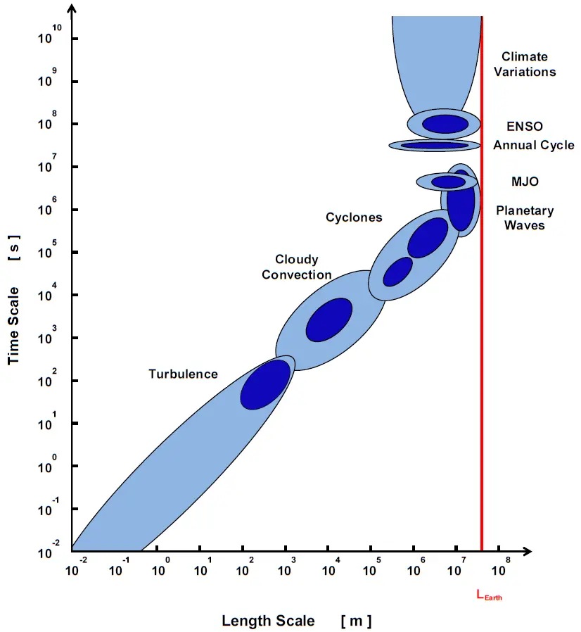 Förstora bildenFigur 1.Typisk längdskala (x-axel) och tidsskala (y-axel) hos de mest fundamentala fenomenen i atmosfären. Notera att axlarna är logaritmiska. De blå skuggade ytorna indikerar de skalor där huvuddelen av respektive fenomens energi vanligtvis förekommer.