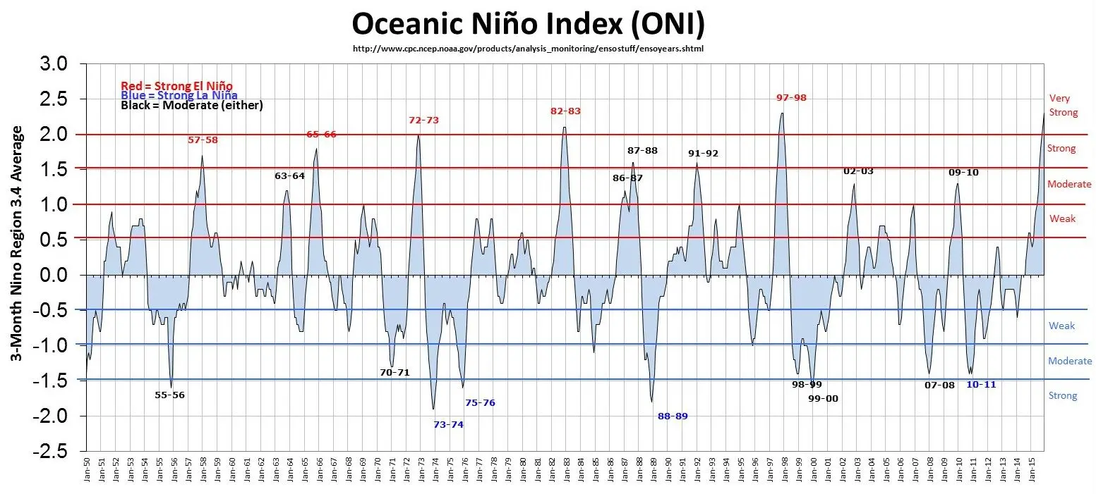 Dessa karakteristiska egenskaper framgår av figur 11 som visar tidsserien av ett ofta använt index för El Niño/La Niña – det så kallade "Oceanic Niño Index" eller ONI. En El Niño anses inträffa då ONI överstiger värdet 0,5 under fem på varandra följande månader. På motsvarande sätt anses en La Niña inträffa då ONI understiger värdet -0,5 under fem på varandra följande månader.