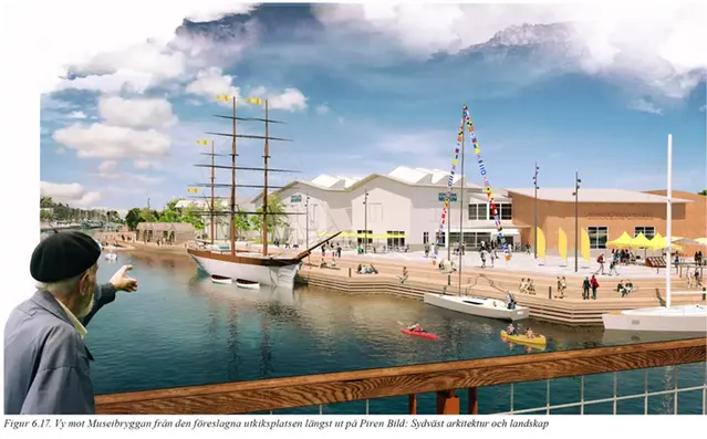 En av de framtidsbilder som används flitigt illustrerar mötet med vattnet. Vyn mot Bohusläns museum gör att medborgaren lätt kan känna igen sig.