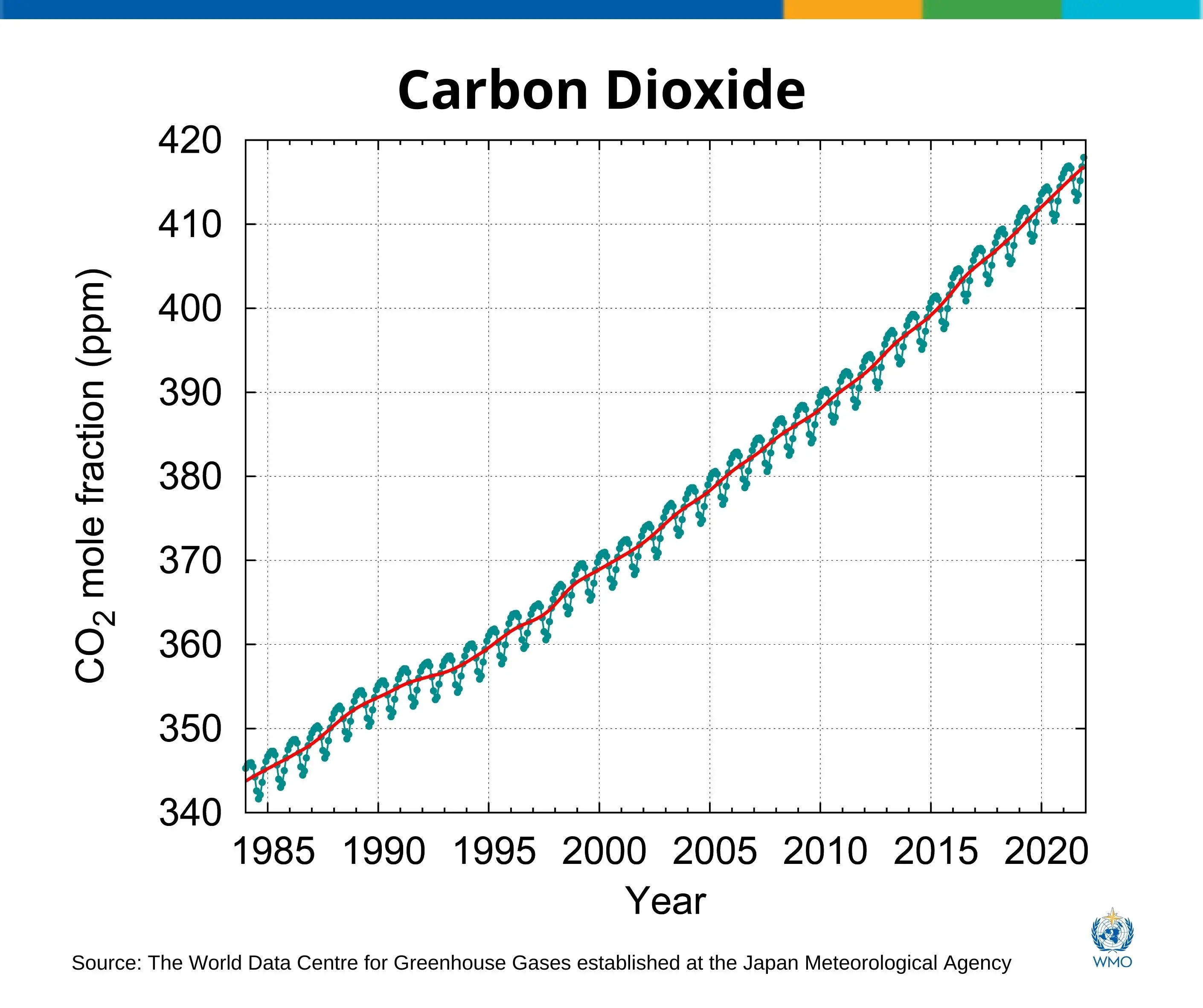 Ökningen av koldioxid från 2020 till 2021 var enligt WMO:s rapport Greenhouse Gas Bulletin större än den årliga ökningen det senaste decenniet. Mätningar från WMO:s globala nätverk av mätstationer visar att nivåerna fortsätter att öka under 2022, över hela jorden.