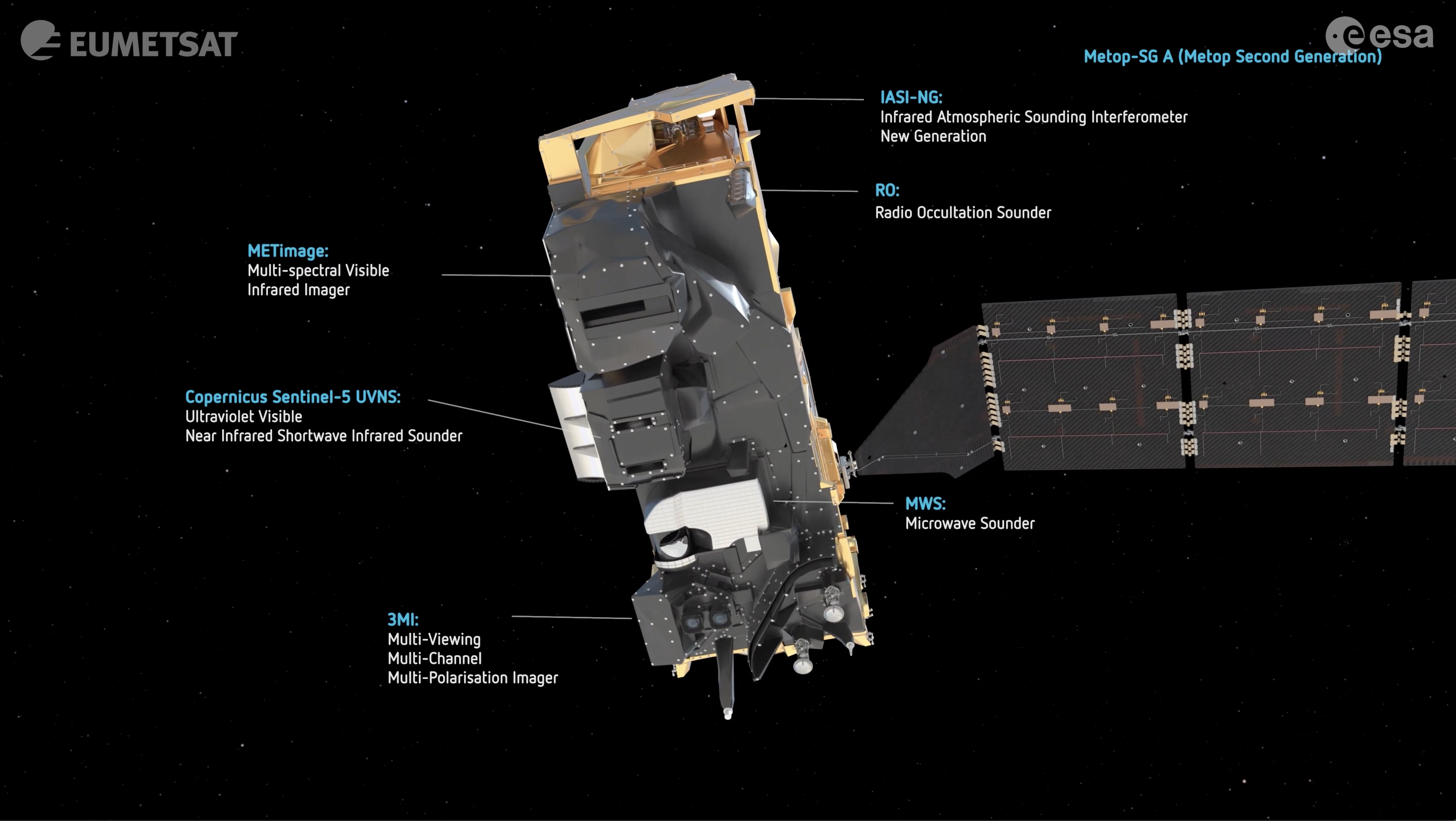 - 3MI – Multi-viewing, -channel, -polarisation Imaging, ett helt nytt instrument som är utformat för att förbättra övervakningen av aerosoler och molnegenskaper