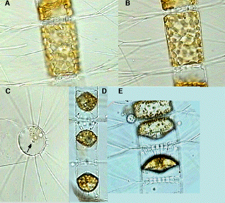 A&B = Cell at two focal planes; C = Terminal valve with central process (=arrow); D&E = Endogenous resting spores. (BF)
