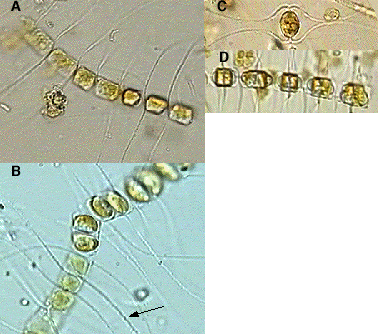 A&B = Vegetative chains (arrow=spines or capilli); C&D = Resting spores (BF)