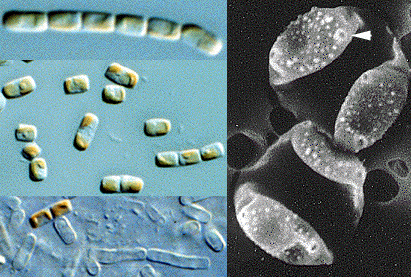 Cells and frustules in culture (DIC) and two frustules (arrowhead=ocellulus) (SEM)