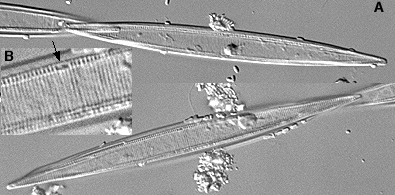 A = Chains; B = Central part with larger interspace (=arrow). (Dry preparation). (DIC)