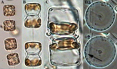 A = Vegetative cells (DIC); B & C = Resting spores (DIC); D = Valve with strutted processes and labiate process (=arrow) (PC)