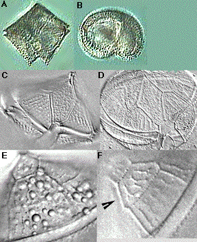 A&B = Cell in ventral and apical views; C&D = Ventral views with 1'-plate; E&F = Dorsal views (arrowhead=2a plate) (DIC)