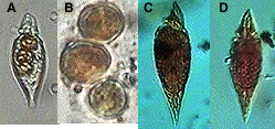 A = A living cell (c. 40 µm) with food particles (BF); B = Food particles (BF); C&D = Lugol fixed cells (DIC)