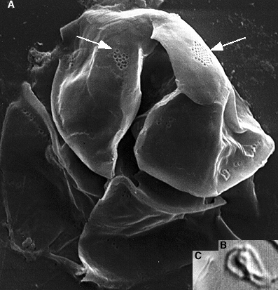 A = Hypotheka with areas with small pores (=arrows) (SEM); B = Po and X plates (DIC); C = 1' (DIC)