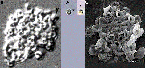 A = A living cell with flagella and haptonema (=arrow), (arrowhead=stomatal coccolith) (DIC); B = Dry preparation of a coccolith case , (DIC); C = An eroded coccolith case (SEM)