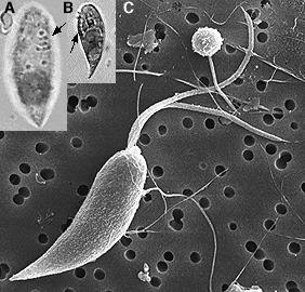 A = A living cell; B = Cell in Lugol (arrows=extrusomes); C = Cell with flagella (A=BF, B=DIC, C=SEM)