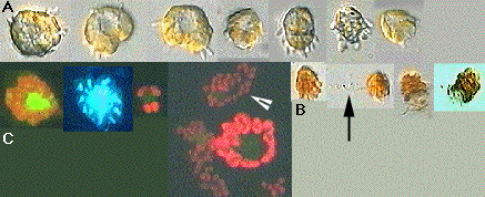 A = Living cells (DIC); B = Cells in lugol (arrow=flagellum) (DIC); C = Cells in epifluorescence microscope (arrowhead=cell of Chattonella sp.)