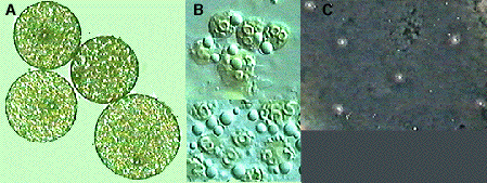 A = Four non-motile cells (DIC); B = Chloroplasts with starch shells and oil droplets (DIC); C = Large punctations (PC)
