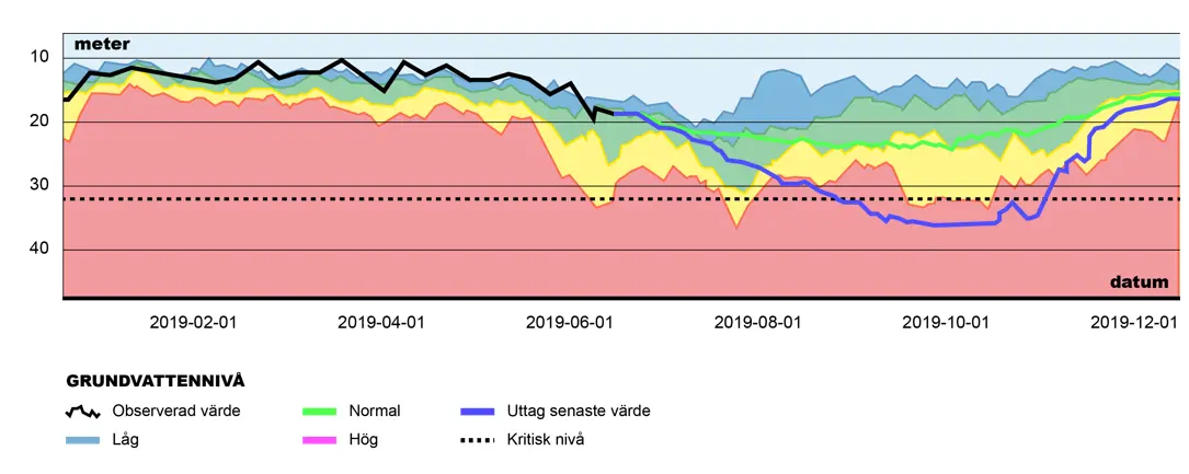 Förstora bildenExempel på presentation av säsongsprognoser för grundvattennivåer. Diagrammet visar uppmätta data för de senaste sex månaderna (svart linje) samt prognoser sex månader framåt (grön och blå linje). De två olika prognoserna visar hur nivåer påverkas av två olika framtida uttagsstrategier. Historiska mätningar av grundvattennivåer visas i bakgrunden i olika färger som motsvarar avvikelser från normalt tillstånd (över, nära eller under normalt)