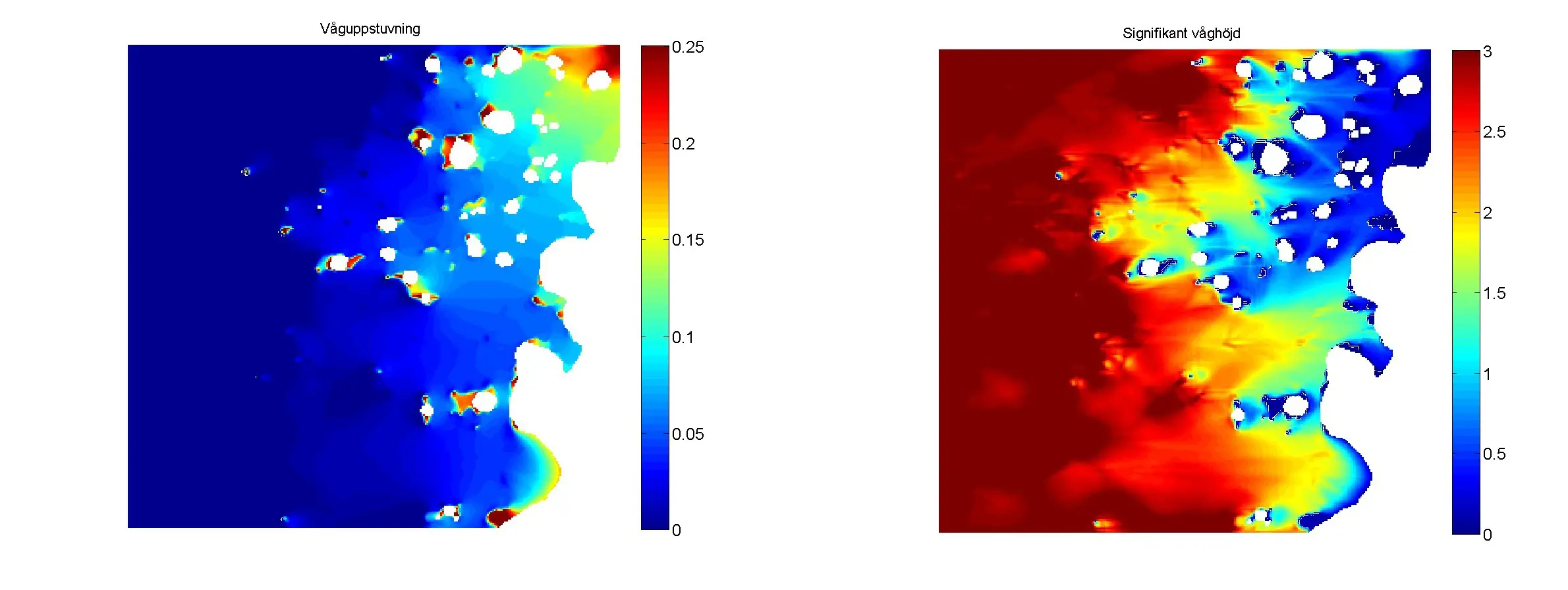 Förstora bildenBilden till vänster visar exempel på modellerad våguppstuvning längs en kuststräcka. Vågorna rullar in från vänster. Röd färg indikerar hög våguppstuvning. Bilden till höger visar exempel på modellerad våghöjd längs en kuststräcka med skärgård. Vågorna rullar in från vänster. Röd färg indikerar höga vågor.