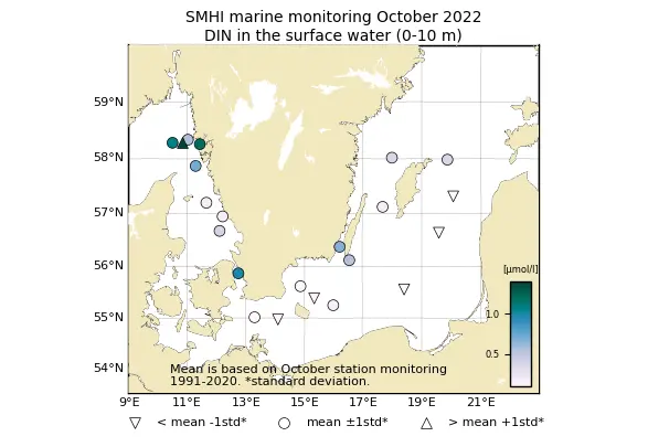 Koncentrationen av näringsämnen i form av DIN (löst oorganiskt kväve) i ytvattnet var under rapporteringsgräns vid stationerna i söder, undantaget BY5, och i Östra Gotlandsbassängen, undantaget BY20. I Västra Gotlandsbassängen normala nivåer vid samtliga stationer, 0,18-0,53 µmol/l. Även normala nivåer vid den kustnära stationen Ref M1V1 i Kalmarsund med 0,68 µmol/l. I djupvattnet i både Östra och Västar Gotlandsbassängen nivåer över det normala.