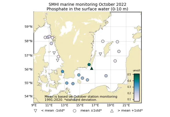 För fosfat var koncentrationerna i Östersjöns ytvatten i stort sett normala för årstiden, undantaget BY39 med något under det normala och BY38 något över det normala. I de södra bassängerna koncentrationer på ca 0,27 µmol/l och Östra och Västra Gotlandsbassängen nivåer på 0,11 – 0,15 µmol/l. Högst koncentrationer uppmättes vid Ref M1V1 och BY39 med 0,43 respektive 0,51 µmol/l. I Östra Gotlandsbassängen djupvatten uppmättes koncentrationer över det normala, annars mest normala nivåer vid de besökta stationernas djupare vattenmassor.