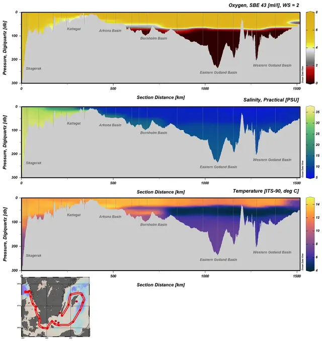 Förstora bildenFigur 1. Snitt som visar syrekoncentration, salthalt och temperatur från mätningar med CTD och MVP, från Skagerrak till Östra Gotlandsbassängen och vidare in i Västra Gotlandsbassängen.