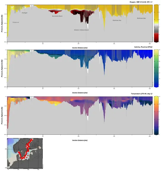Förstora bildenFigur 1. Snitt som visar syrekoncentration, salthalt och temperatur från mätningar med CTD och MVP, från Skagerrak till Östra Gotlandsbassängen och vidare in i Västra Gotlandsbassängen.