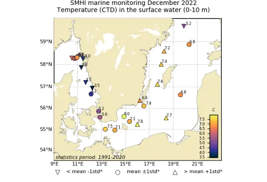 Temperaturen i ytvatten hade sjunkit med mellan 6-8 grader och var nu under normal tre av de sju stationerna i havsområdet. Lägst temperatur, ca 4 grader var det vid stationen P2 i höjd med Marstrand och Släggö i Gullmarsfjordens mynning. I Å-snittet med fem stationer från kusten till öppet hav varierade temperaturen mellan 5-7 grader och var under normal vid den västligaste (Å17) och den östligaste (Å13) stationen. Salthalten i ytlagret var normal vid alla stationer och varierade mellan knappt 26 psu vid stationen P2 till drygt 30 psu vid stationen Å17. Vid samtliga stationer utom den västligaste Å17 fanns en termoklin runt fem meter med kallt välblandat ytvatten på 3,5-4,0 grader, vid Å17 var det termoklinen något grundare. Vid de flesta stationer fanns ett lager under termoklinen på djup mellan 20-50 m med vatten som hade temperaturer runt 10 grader vilket är över normalt. Sedan minskade temperaturen åter och var normal i djupvattnet, mellan 7-9 grader.