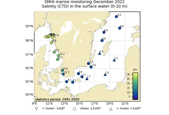 Temperaturen i ytlagret i Egentliga Östersjön var fortfarande över normal vid hälften av stationerna och varierade mellan 7–8 grader. Ytvattnet hade alltså kylts ned ca 4 grader sedan expeditionen i november. Salthalten i ytlagret varierade mellan 6,8 psu i Norra Egentliga Östersjön och 8,1 psu i Arkona bassängen. I november var salthalten över normal i Bornholmsbassängen och här hade den minskat sedan dess och var nu endast lite över normal vid stationen BY5 i Bornholmsbassängen med 7,7 psu. Salthalten var över normal även vid de två stationer som kunde provtas i Östra Gotlandsbassängen samt vid den södra stationen i Västra Gotlandsbassängen (BY38 Karlsödjupet).