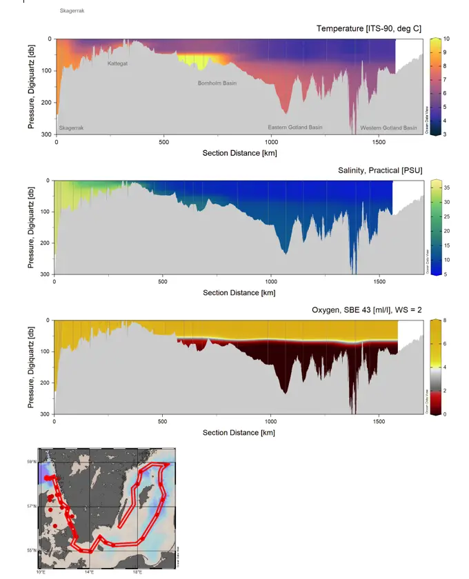 Förstora bildenFigur 1. Snitt som visar syrekoncentration, salthalt och temperatur från mätningar med CTD och MVP, från Skagerrak till Östra Gotlandsbassängen och vidare in i Västra Gotlandsbassängen.